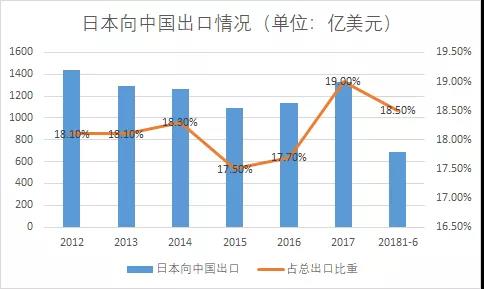 所以到了2017年,中國(guó)對(duì)日本產(chǎn)品的需求也大幅提升。上圖中最后一個(gè)藍(lán)柱是2018年1-6月的進(jìn)口額。也就是說(shuō),半年時(shí)間,中國(guó)對(duì)日本商品的需求已經(jīng)達(dá)到2017年時(shí)的一半還多。