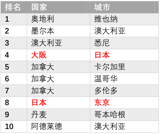 根據(jù)經(jīng)濟(jì)學(xué)人智庫(kù)(EIU)最新發(fā)布2019年度全球宜居性報(bào)告,根據(jù)穩(wěn)定、醫(yī)療、文化和環(huán)境、教育和基礎(chǔ)設(shè)施5個(gè)大類的30個(gè)質(zhì)量和數(shù)量因素,對(duì)140個(gè)城市進(jìn)行了排名,日本東京和大阪入圍前十。