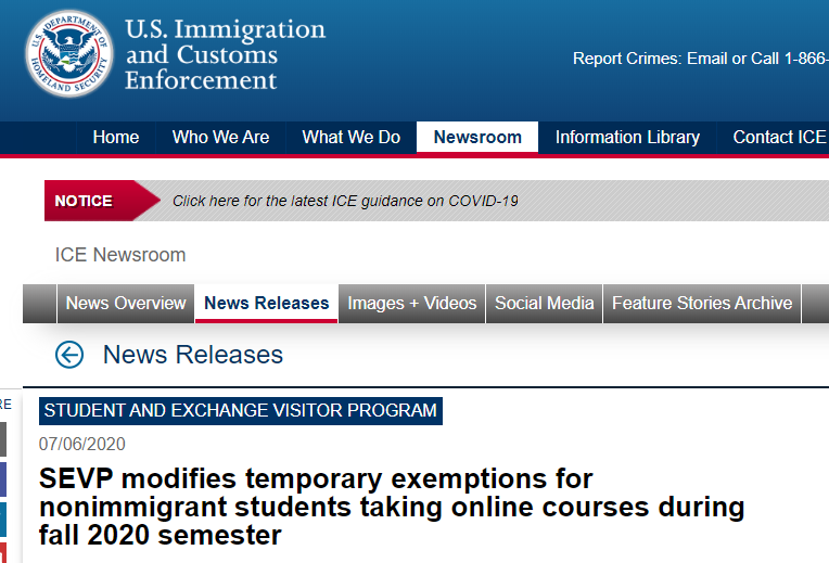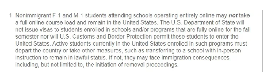 美國時間7月6日下午,美國移民與海關(guān)執(zhí)法局突然宣布:修改非移民學(xué)生2020年秋季學(xué)期在線課程的臨時豁免,并對持F1獲M1簽證的留學(xué)生作出2020年秋季學(xué)期在線課程新規(guī)定。