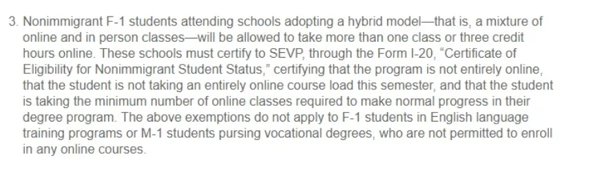 針對學(xué)校采取“線上線下”混合模式,假如你持有F1簽證并且想留在美國境內(nèi),可選擇多門網(wǎng)課,但同時必須選修至少1門線下授課課程。