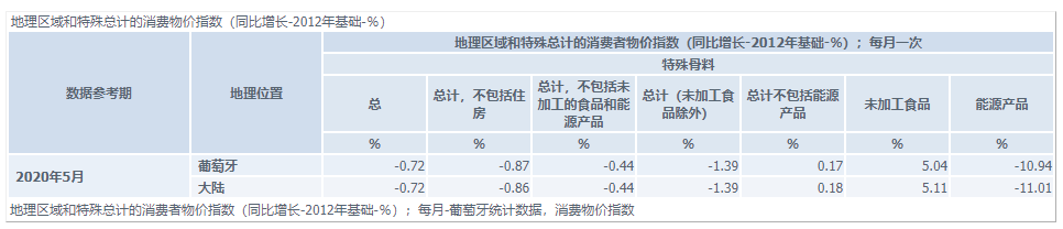 截至2020年5月,官方數(shù)據(jù)表明葡萄牙消費(fèi)價格指數(shù)CPI年同比增長率總體下降0.72個百分點(diǎn),意味著葡萄牙的貨幣實際購買力有所上升,物價相對下降。未加工食物一欄中CPI上升5.04%,食品類別CPI有所上升,受到COVID-19流行病和政府政策影響,食品原材料供應(yīng)價格大漲。