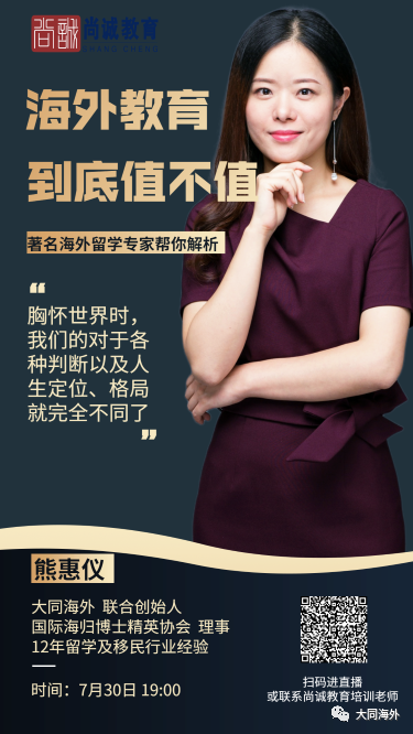 目前,全世界在新冠肺炎的影響下,很多家長(zhǎng)也在猶豫到底要不要送小孩子去留學(xué),每年留學(xué)費(fèi)用的花銷,從20萬(wàn)至100萬(wàn)人民幣不等,對(duì)于大部分家庭來(lái)說(shuō)是一個(gè)重要的投入,出國(guó)留學(xué)到底是為了什么?大同海外攜同尚誠(chéng)教育在7月30日舉辦了一場(chǎng)公益直播,跟各位朋友探討了海外教育的價(jià)值!