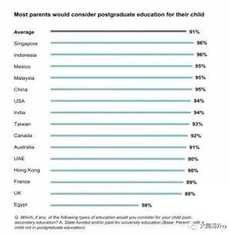 85%的家長(zhǎng)考慮讓孩子接受本科教育,95%的家長(zhǎng)考慮讓孩子接受研究生教育。超過(guò)四分之三的家長(zhǎng)把完成研究生教育看做是孩子順利就業(yè)的一個(gè)重要門檻, 95%的中國(guó)家長(zhǎng)有此想法,這個(gè)水平高于全球平均值。