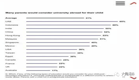 全球超過(guò)五分之二的家長(zhǎng)希望送子女留學(xué),中東及亞洲的家長(zhǎng)超過(guò)一半希望送孩子留學(xué)。54%的中國(guó)家長(zhǎng)希望送孩子留學(xué)。