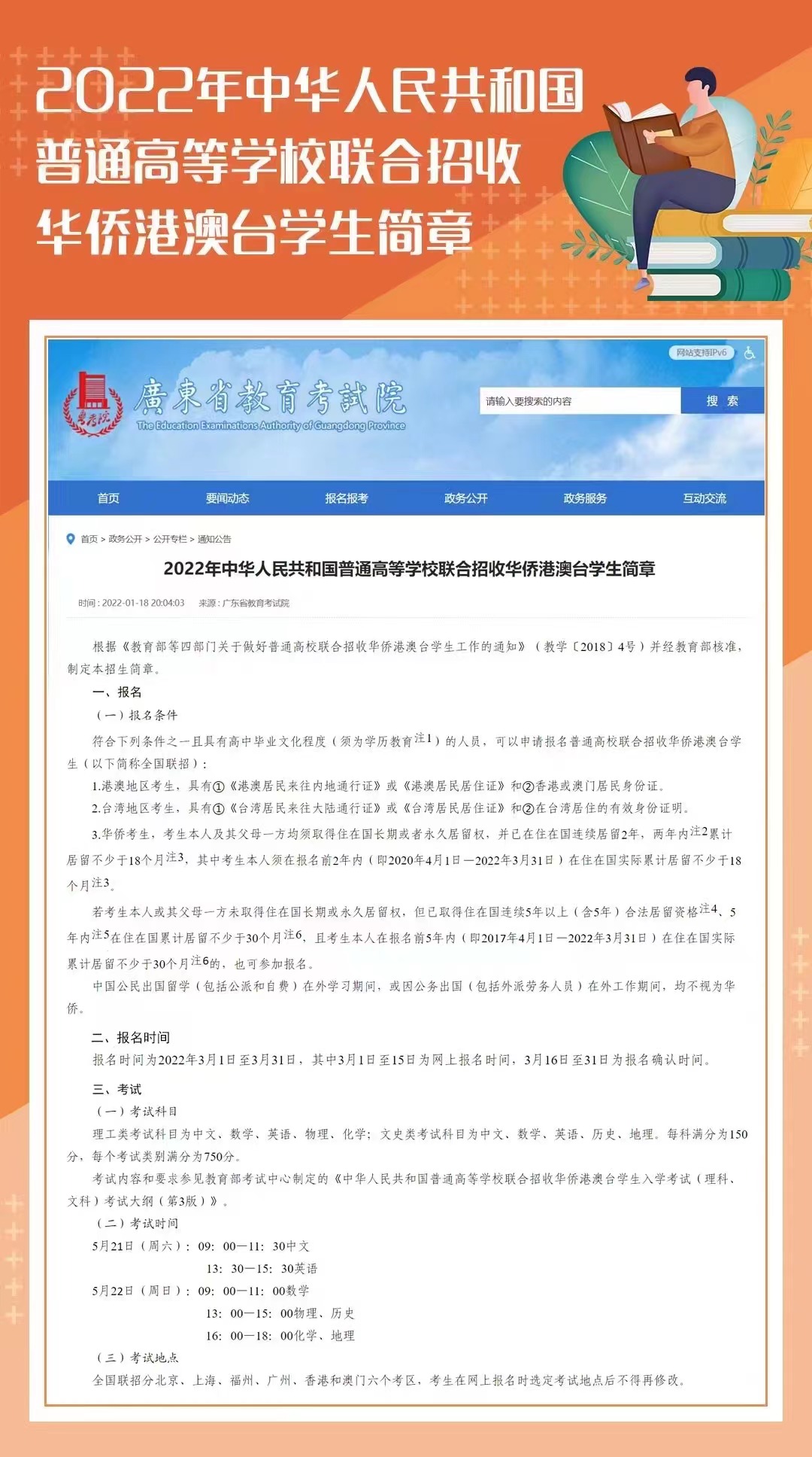港澳臺(tái)華僑生聯(lián)考,是由中國教育部單獨(dú)為海外華僑和港澳臺(tái)學(xué)生專門設(shè)計(jì)的高考,滿足海外華僑及港澳臺(tái)學(xué)生入讀內(nèi)地大學(xué)愿望,提供國內(nèi)接受高等教育機(jī)會(huì),也是港澳臺(tái)學(xué)生入讀國內(nèi)名校的最優(yōu)途徑。
